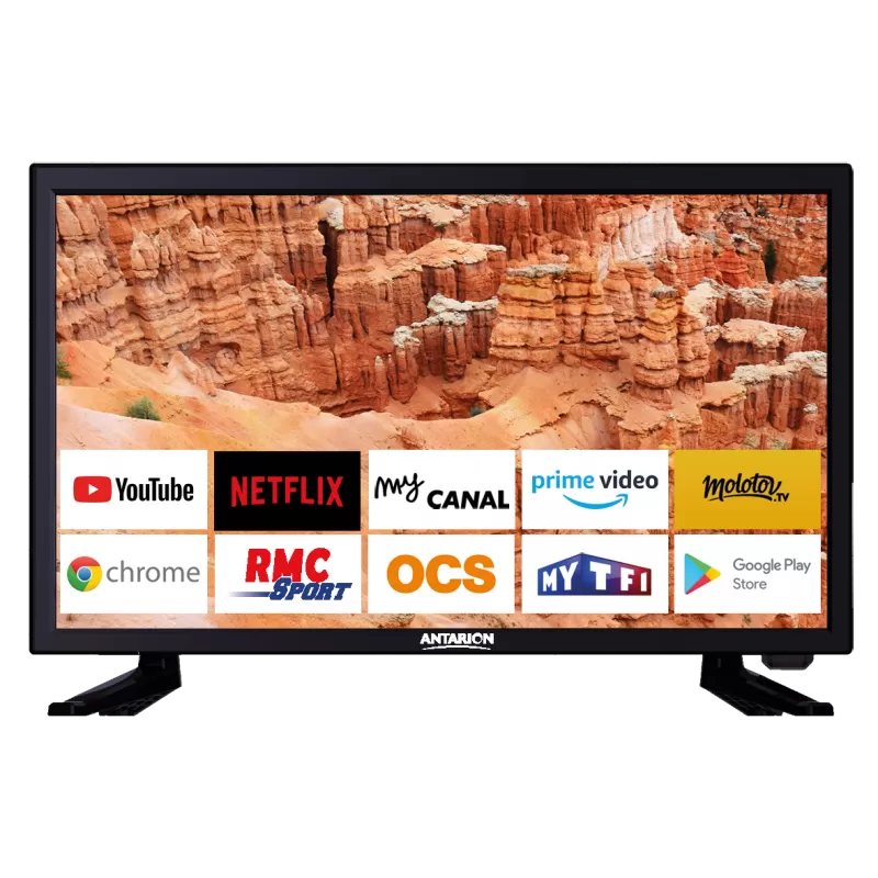 Téléviseur 12V Smart Led de chez ANTARION avec un écran de 19 » donnant accès à toutes les plateformes de streaming dans votre camping-car grâce à votre connexion Wifi.
