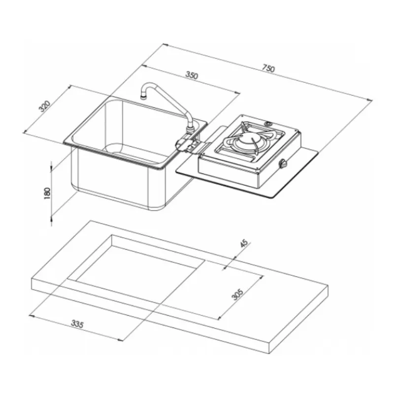 Caractéristiques du combiné gaz + évier Foldy carrée pour van & bateau par CAN :