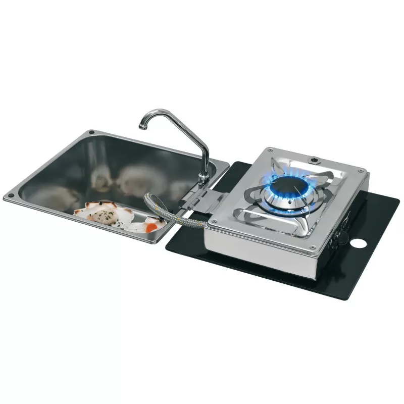 Le Foldy carrée de CAN est un combiné évier inox et réchaud gaz 1 feux basculant pour l’aménagement des vans, fourgons aménagés ou des bateaux. S’encastre dans le plan de travail de la cuisine.