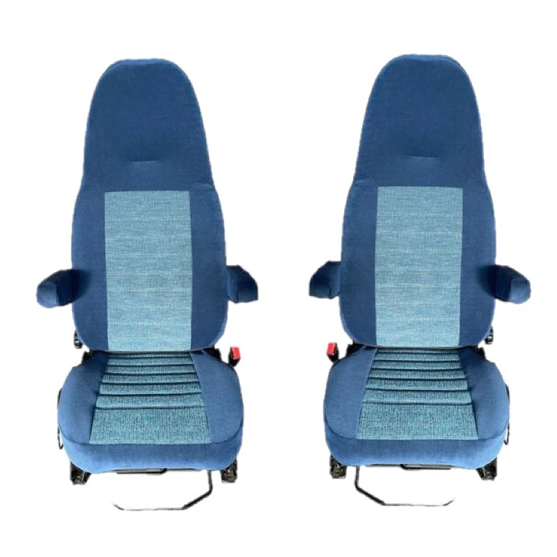 Cet équipement est complet et comporte l’appuie-tête, les accoudoirs ; coloris bleu foncé et gris.