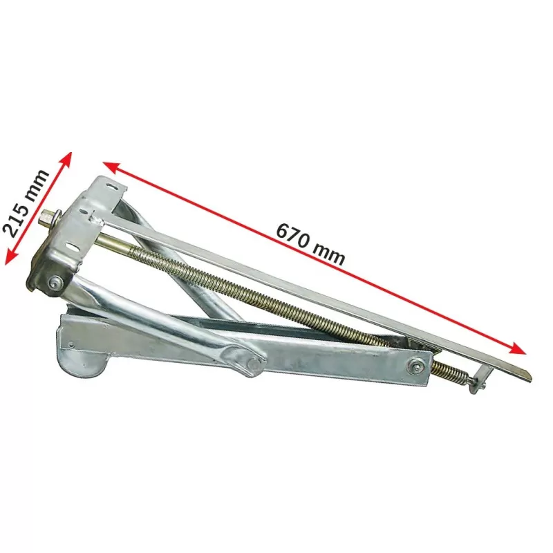 Une fois déplié, le vérin offre une hauteur max de 497 mm. Les entraxes de fixations sont de 215 x 670 mm. Livré à l’unité, le vérin fait 3,5 kg.