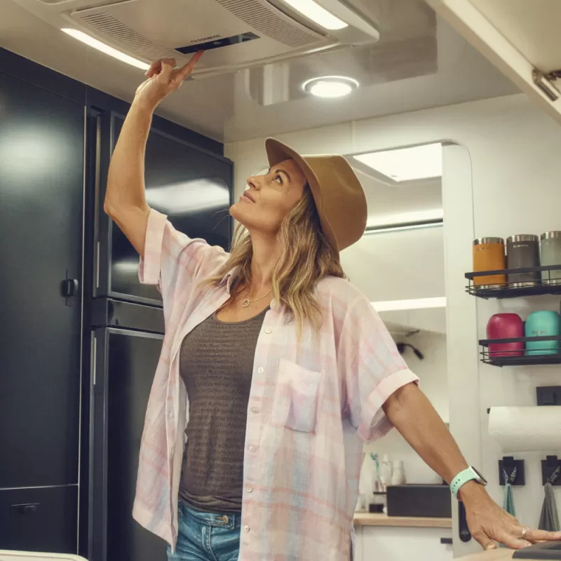 Cette unité de distribution d’air, à la fois élégante et extrêmement fine avec ses 48 mm d’épaisseur, s’intègre parfaitement dans les intérieurs modernes des véhicules de loisir.