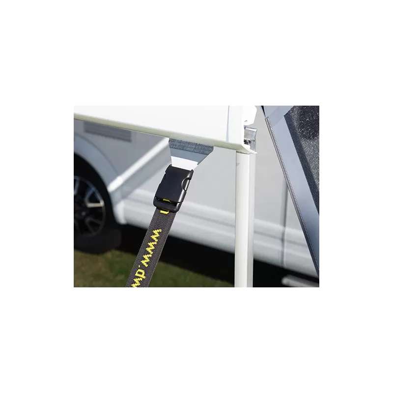 La face avant Happy Sun est équiper de clips pour fixer facilement une sangle anti-tempête (en option) et ainsi garantir un solide arrimage de vos équipements extérieurs. Pour plus de commodités, la face avant est enroulable vers le haut, cela vous permet de vous adapter selon le temps qu’il fait sans enlever pour autant tout votre matériel.