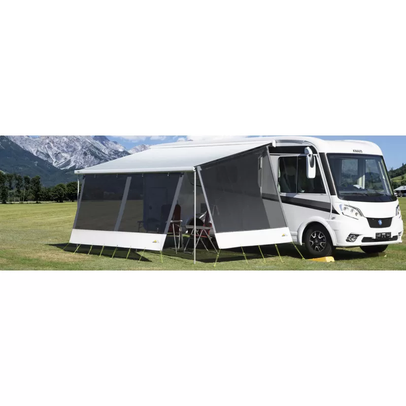 Habillage de façade de la marque DWT, cette façade est pourvu d’un tissu Mesh PVC enduit polyester, lavable, il est résistant aux intempéries et vous permettra de protéger votre campement du vent, de la pluie mais surtout du soleil.