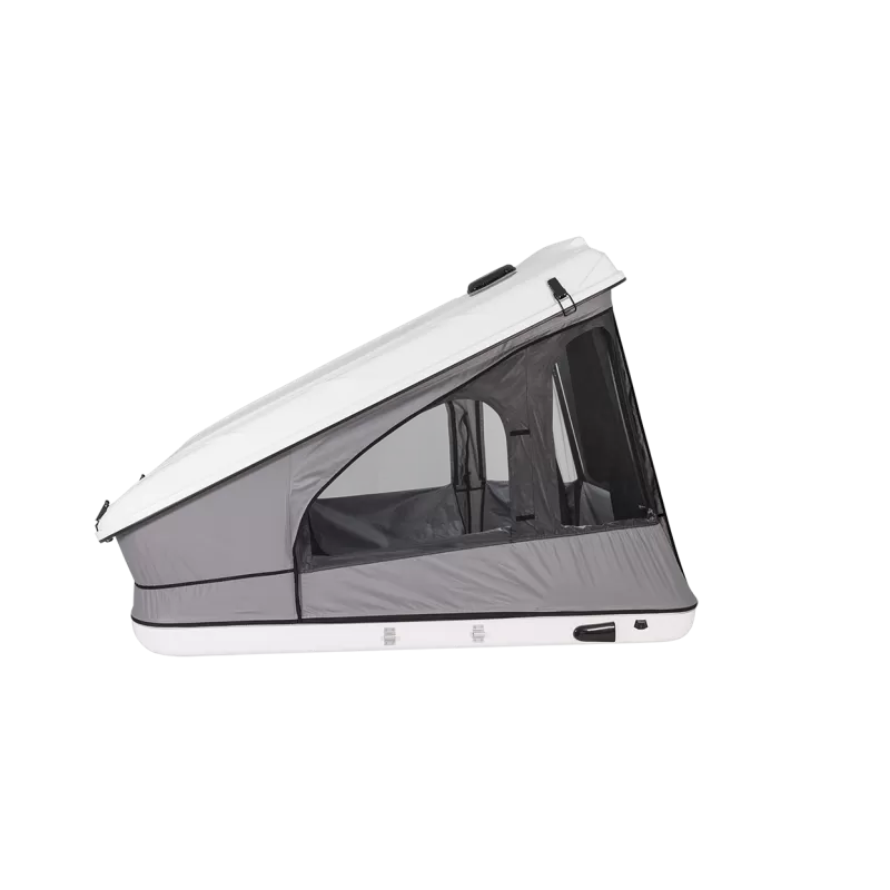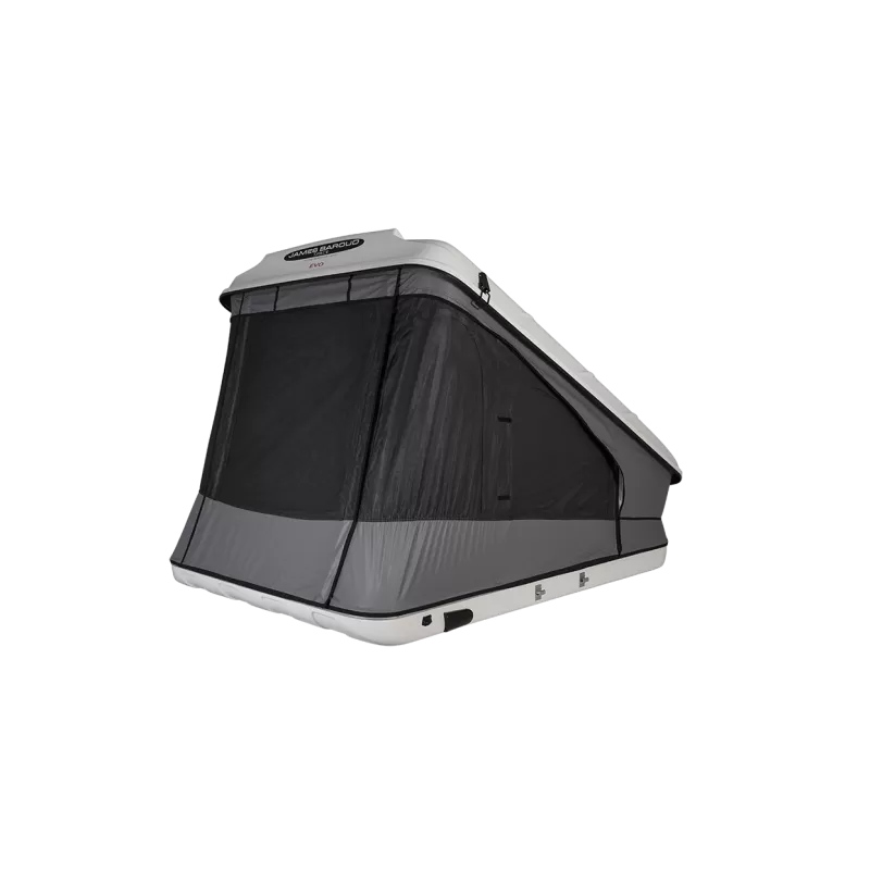 La tente de toit à coque rigide, le modèle Space Evo est fabriqué en fibre de verre, robuste mais légère, elle conviendra parfaitement à toutes les barres de toit, que vous ayez un fourgon aménagé, un mini-van ou une voiture. Le modèle Space possède une avancée assez large de 40 cm permettant ainsi d’avoir un filet de rangement sur toute la largeur de la tente.