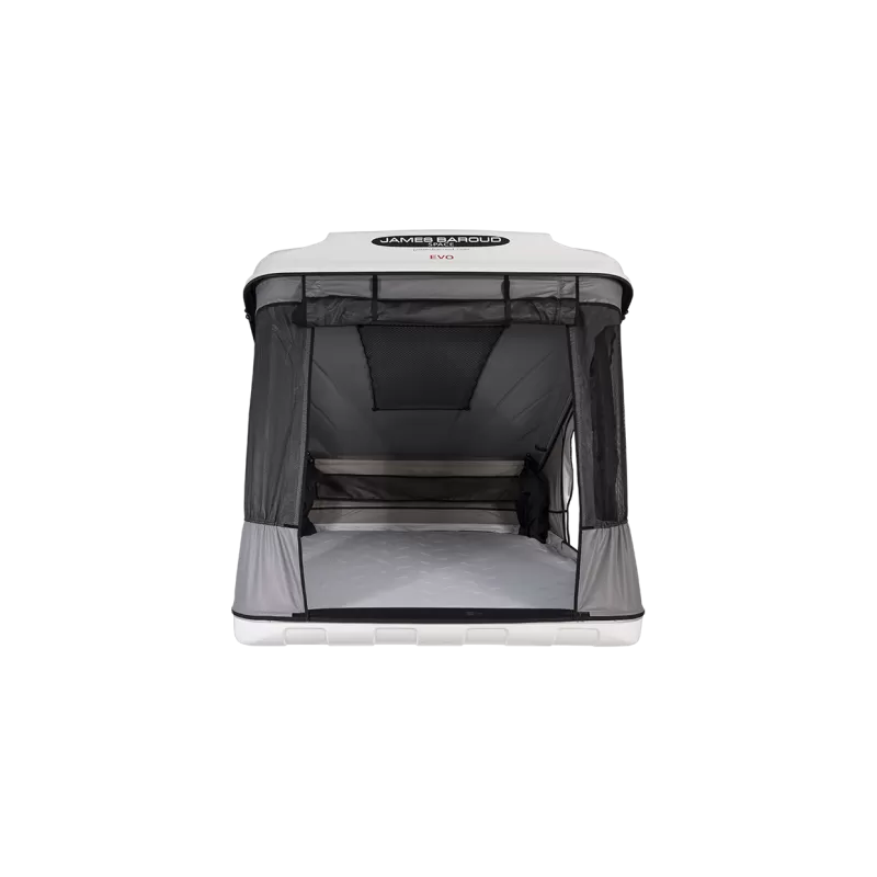 Tente de toit de la marque JAMES BAROUD, le modèle Space Evo est un équipement extérieur idéal pour dormir confortablement sans contrainte, la tente de toit à coque rigide est simplement fixée sur des barres de toit de fourgon ou de voiture.