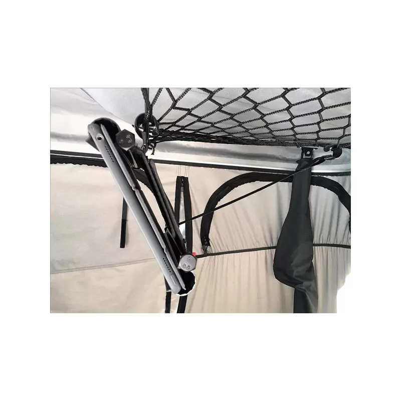 Support de la marque JAMES BAROUD pour suspendre aisément votre tablette au filet de rangement à l’intérieur de la tente de toit. Vous pourrez ainsi regarder vos programmes préférés facilement comme à la maison.