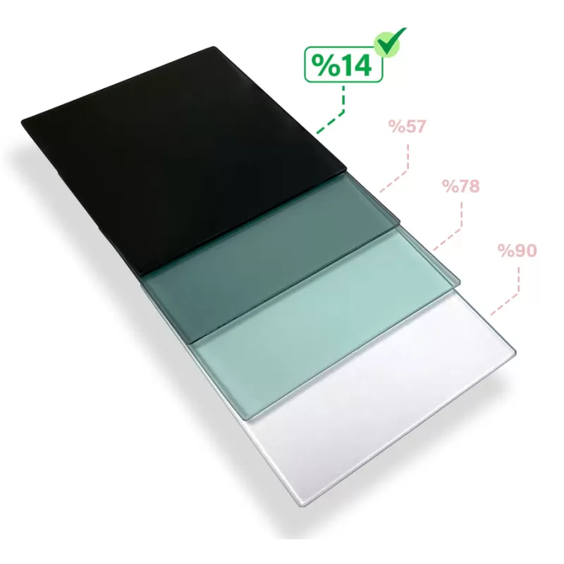 Idéal pour conserver une température agréable à l’intérieur du véhicule, une bonne intimité tout en laissant entrer la lumière, OMAC propose une Transmission de Lumière Visible (TLV) de 14%. La baie teinté à 76% laisse passer 14% de lumière à l’intérieur du véhicule.