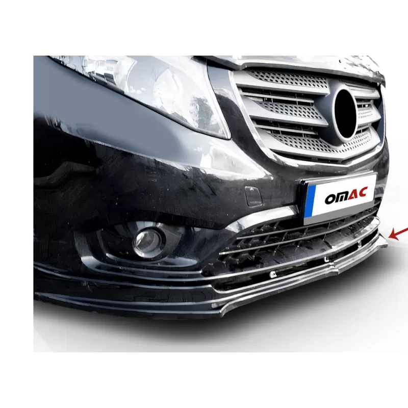 Lame de pare-chocs OMAC avant certifié ABE pour Mercedes-Bens Vito W447 depuis 2014. Cet accessoire pour pare-choc de couleur noir donne un look personnalisé à votre van aménagé.