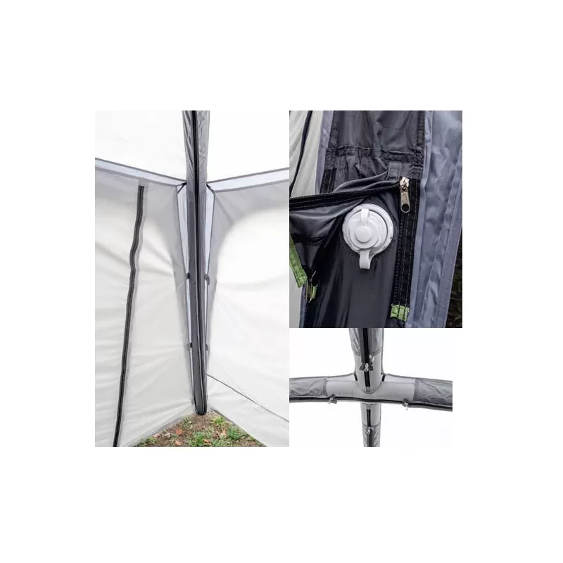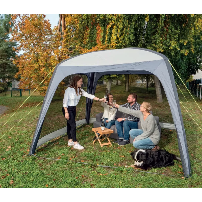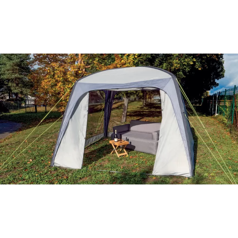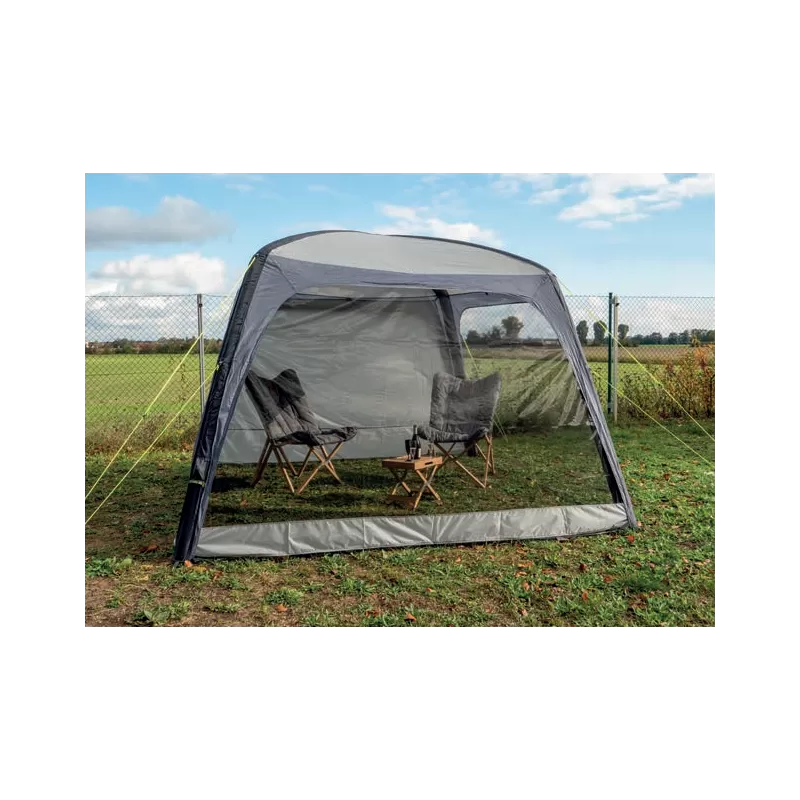 La tonnelle Linosa 350 de chez REIMO est pourvu d’arceaux gonflables qui se mettent en place facilement et rapidement. Cet abri est indépendant et se dispose sur votre zone de campement à l’aide du système d’haubanage fourni.