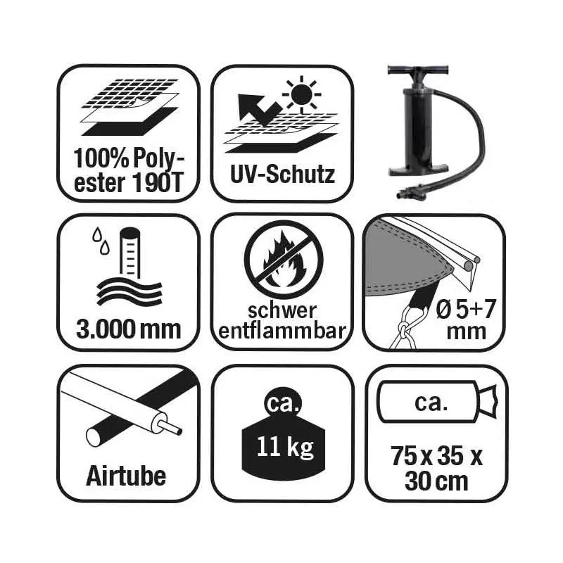 – Livré avec : piquets, tendeur, gonfleur, sac de rangement