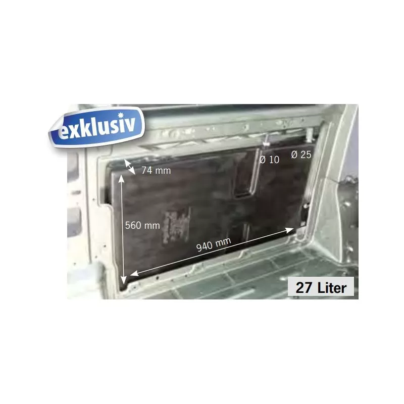 Réservoir, cuve pour eaux usées 27 L spécial pour fourgon aménagé VW T5 à intégrer dans la paroi intérieure située derrière le siège conducteur.