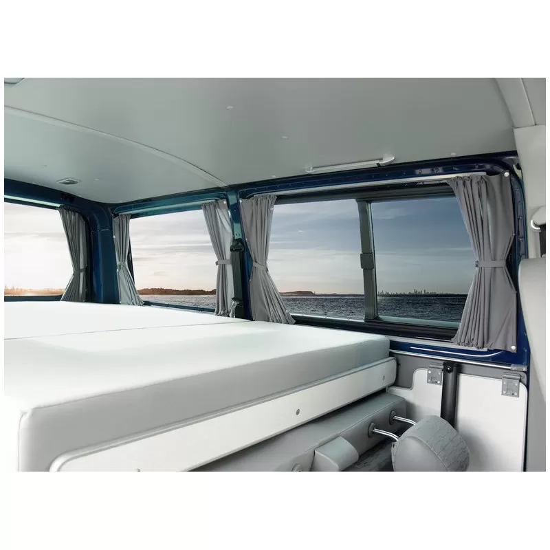 Jeu de rideaux occultants REIMO pour fenêtres et vitres latérales arrières + hayon pour les fourgons et vans aménagés VW T5 et T6. Sur rail, ces rideaux en tissu sont coulissants.
