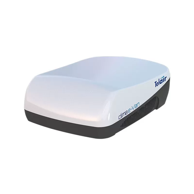 Le Clima e-Van 5400H de TELAIR est un climatiseur de toit 230 V spécial pour van, fourgon ou camping-car compact de 4 à 6 m de long. Elle offre une puissance de 1700 W et puissance de refroidissement de 5800 BTU. Mode pompe à chaleur pour l’hiver.