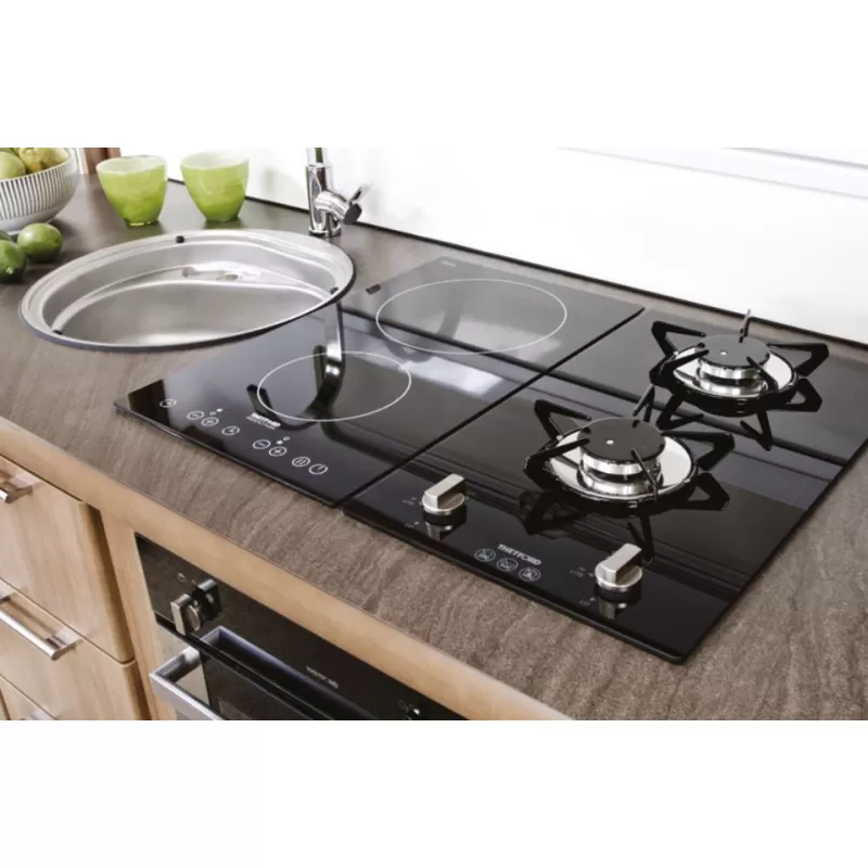 Réchaud avec une surface de cuisson en verre équipée de brûleurs de tailles différentes pour un aménagement de votre fourgon aménagé toujours plus moderne.