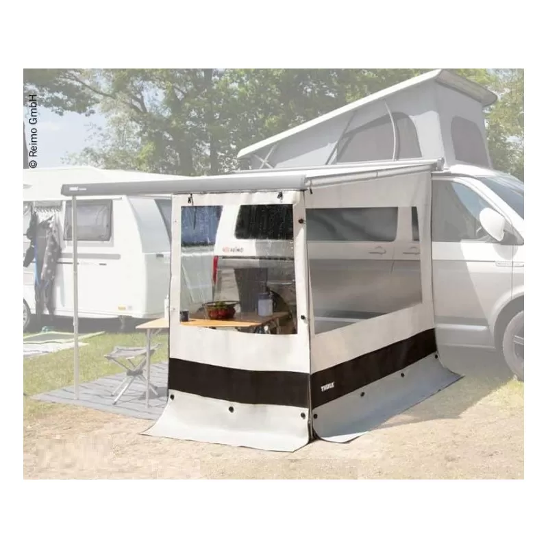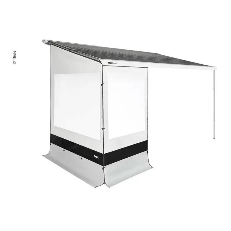 La taille (hauteur) des façades et parois a été spécifiquement adaptée (pour hauteur du store de 180 à 200 cm du sol). Comme toujours chez THULE, cet accessoire pour fourgon aménagé est bien fini et livré avec un sac de rangement et transport.