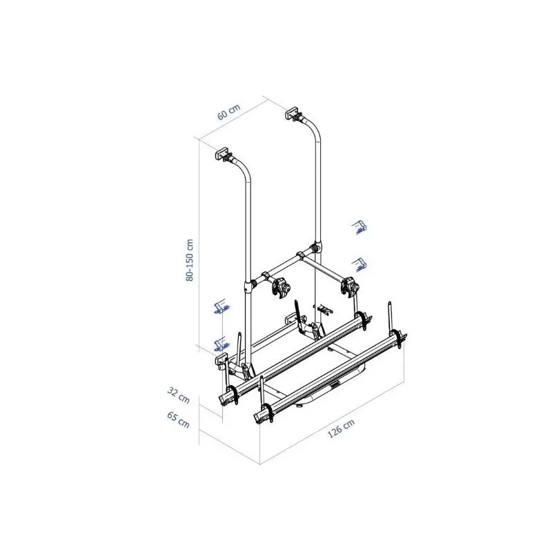 Spécialement développé pour les fourgons aménagés en camping-car, ce porte-vélos est dessiné pour s’installer sur les portes arrières. En effet, avec ses 55 cm d’entraxe en largeur il peut facilement s’installé sur la majorité des fourgons du marché. En hauteur, le cadre est télescopique de 80 à 150 cm permettant de fait une légère courbure de la porte. Conçu pour transporter deux vélos, chaque rail peut supporter 2 vélos ; il offre une solution simple pour tous les véhicules dont le modèle de porte-vélos spécifique n’existe pas.