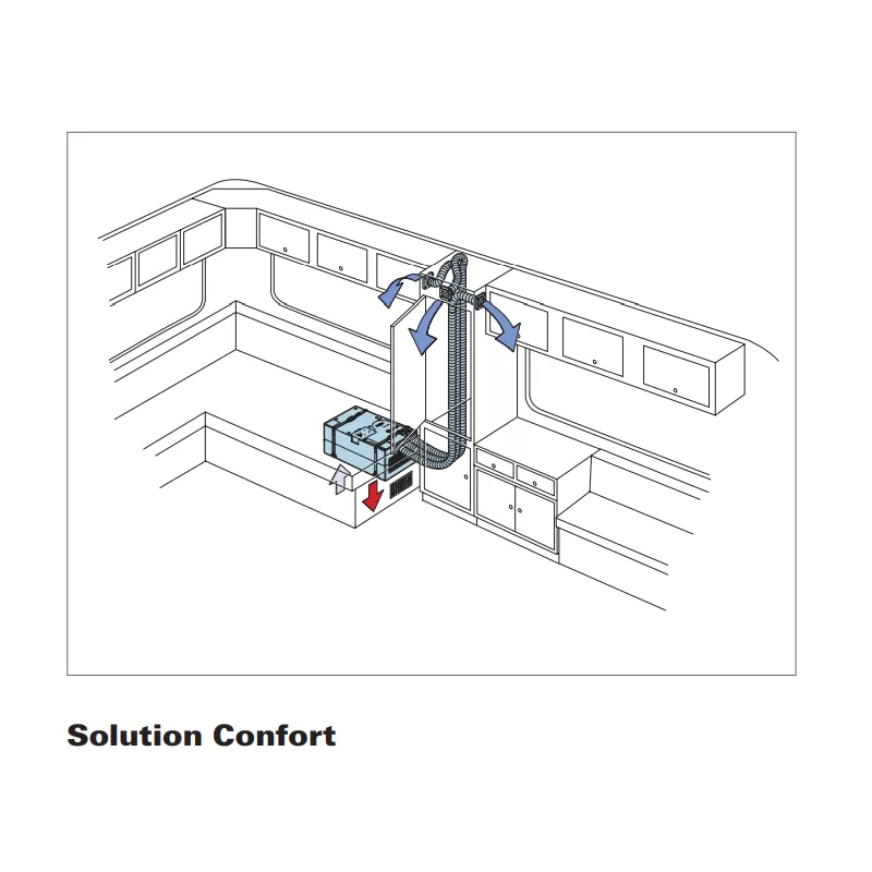 - Solutions Confort : Bouche d’air installé en hauteur, offrant une véritable « douche d’air froid » dans l’aménagement. Il faut alors prévoir le passage des gaines du climatiseurs jusqu’aux bouches de sorties. C’est la solutions la plus performantes, mais qui peut être compliqué à intégré sur un aménagement existant ou dans un camping-car n’étant pas équipe.