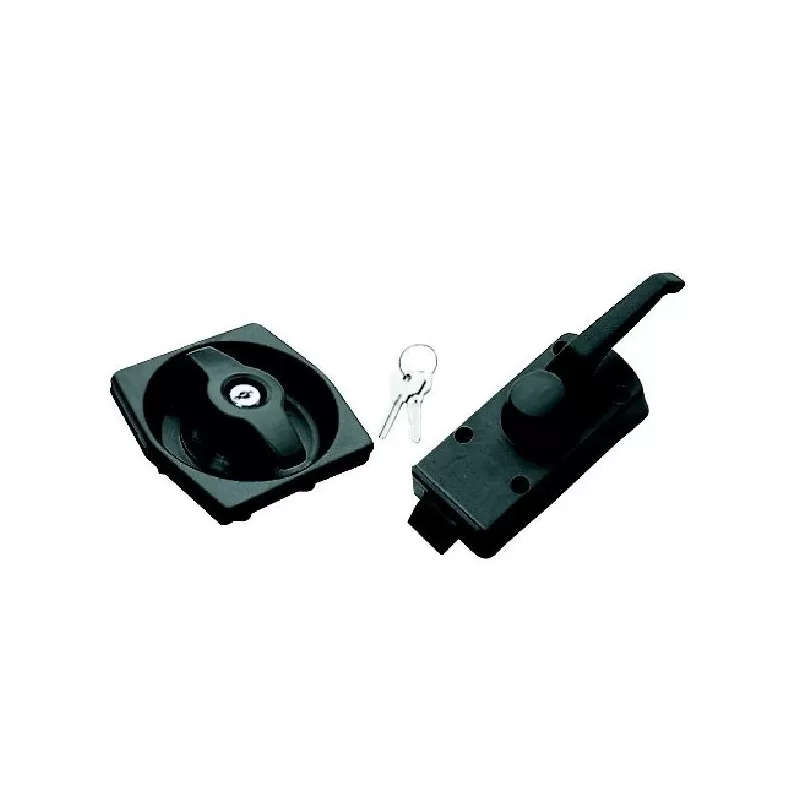 Serrure pour porte d’entrée ZADI type carrée de couleur noire pour caravane, très répondue sur la marché livrée avec barillet et clés.